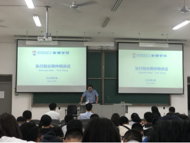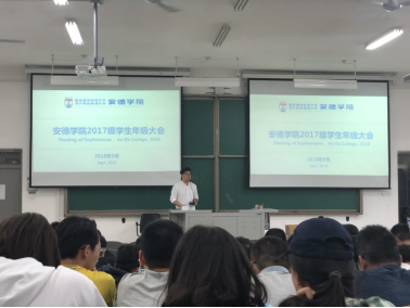 2017级学生年级大会。我院执行院长熊仲明,党支部书记、副院长刘言正,副院长赵蕾,行政办公室主任郑涛,教学办公室主任王玉洁参加大会,会议由学工办主任、2017级辅导员孙灵通主持。