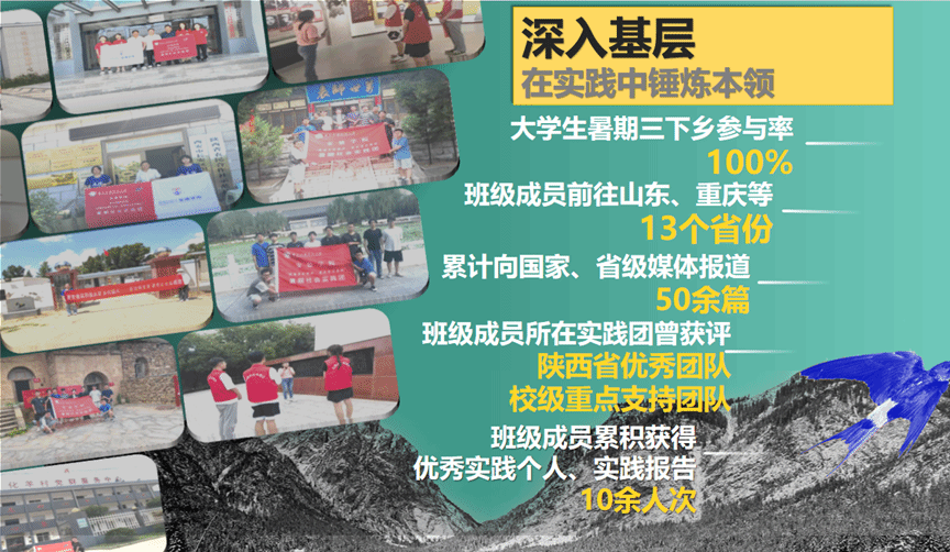 班级坚持在行动中提升素养,50%以上同学服务于各类学生组织,曾在校学生会、校团委等担任主要负责人的有9人;力求“全面发展”,6人签约视觉中国等平台,作品被CCTV采用。在乡村实践中触摸民生百态,在广厦楼宇融合学科视角。班级成员积极投身实践,全体成员参与“三下乡”暑期社会实践,赴全国多个地区,向国家级新闻平台投稿50余篇,所在团队获得“陕西省优秀团队”称号,10余人获个人奖励。班级成员累计志愿时长超2000小时,中国青年志愿者注册率100%,10余人获“优秀大学生志愿者”,12人获疫情志愿服务证书,累计参加各类志愿服务活动50余项。