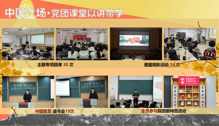 班级始终坚持两种课堂引导同学进行思政教育。党团课堂,班级共开展主题团课30次,爱国观影活动24次,中国智慧读书会19次;实践课堂,班级组织“我为同学做实事”活动16次,开展“重走长征路”系列活动与“敬畏·感恩·责任”主题班会。