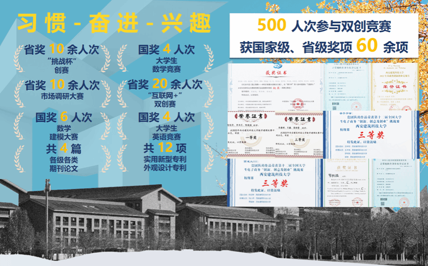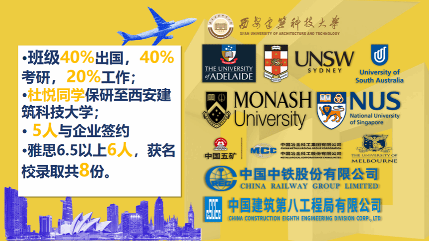聚焦未来规划,班级开展“针对化”奋进未来制,开展经验分享讲座,分享毕业生成功经验;组织“为你寻找学习搭子”活动,助力考研复习和雅思托福备考;协助学院联系工作,力争让班级成员有机会参加联合国实习。班级成员中,约有五分之四的同学选择升学,其中1人已保研至西安建筑科技大学,8名同学已获海外名校录取;已有5人与企业签约,找到心仪的工作。