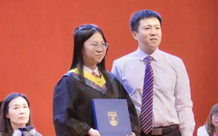 执行院长熊仲明教授、副院长赵蕾教授为毕业生扶正流苏,颁授学位并合影留影。