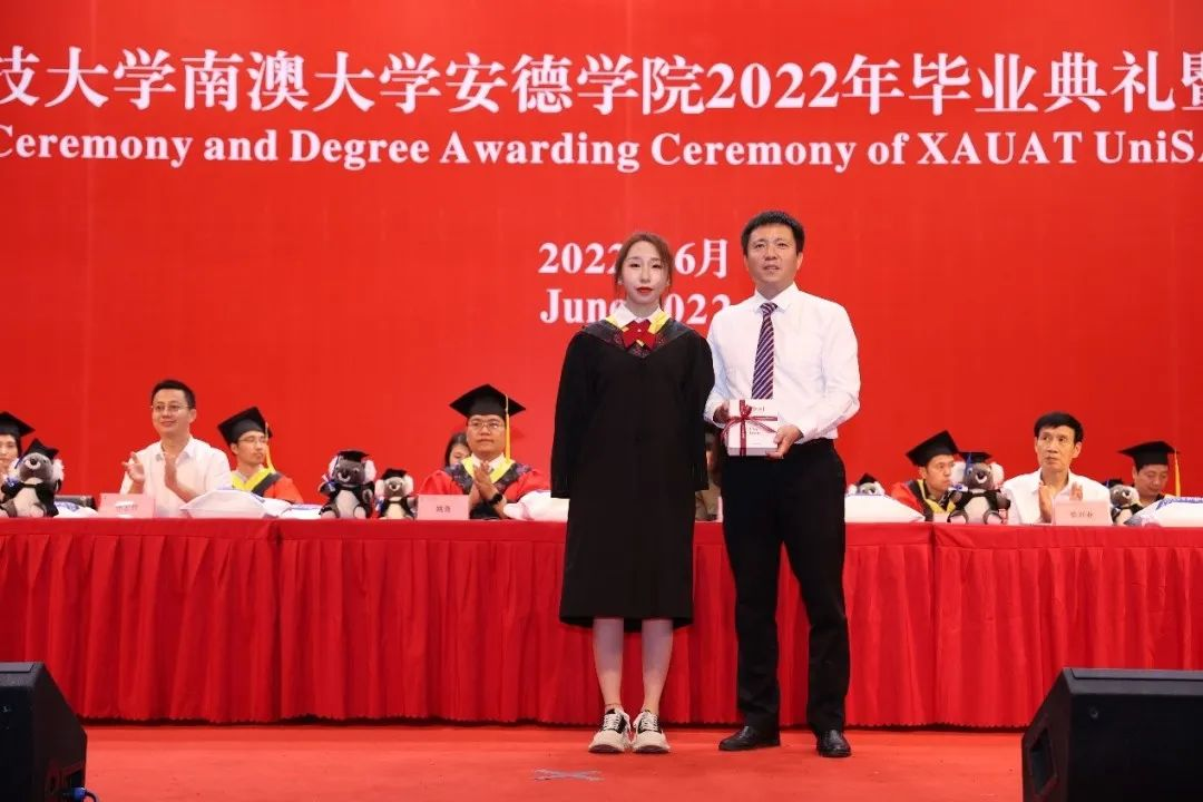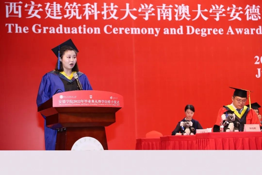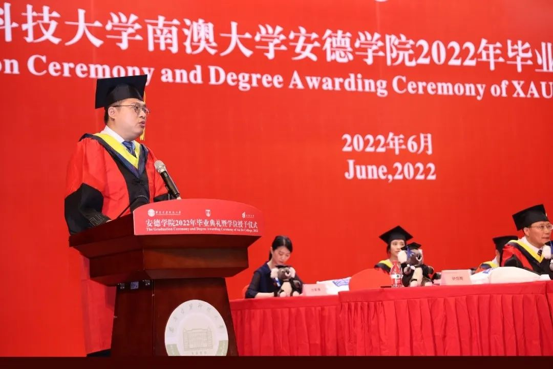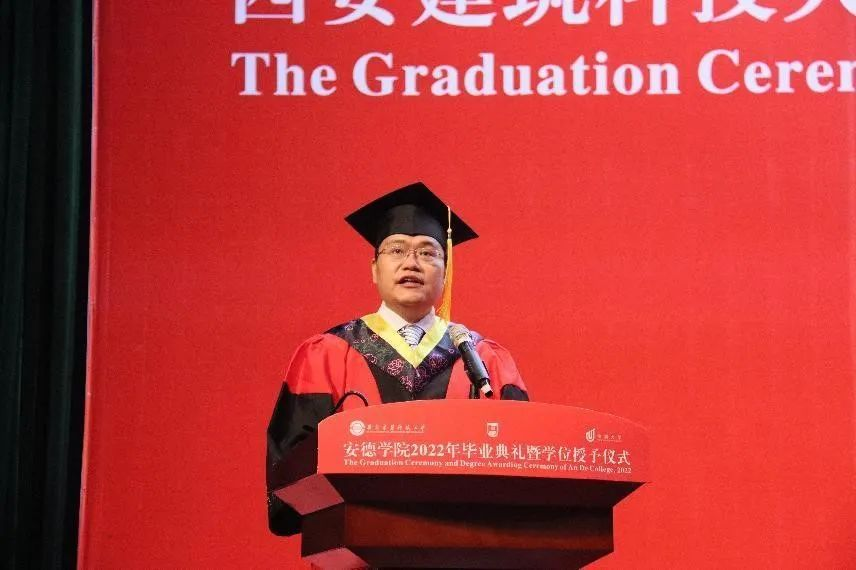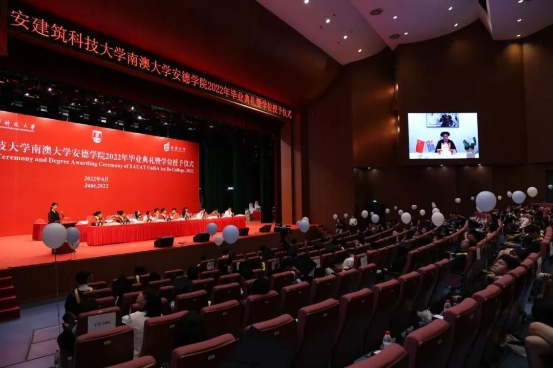 2022年毕业典礼暨学位授予仪式在西安建筑科技大学草堂校区紫阁大礼堂和澳大利亚南澳大学两个会场线下线上同时举办。