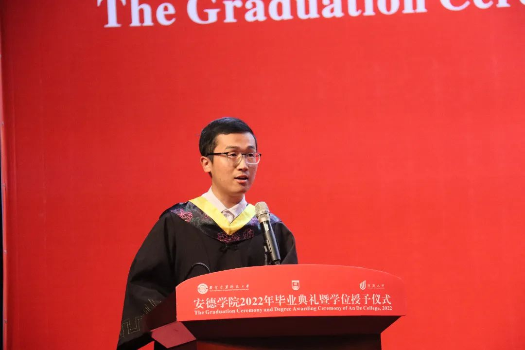 2022届毕业生整体深造率近50%,其中申请到全球QS排名前100名高校的学生占74.2%。共有97人收获了273封国外、境外知名高等学府offer;25人保送或者考取国内研究生,即将奔赴同济大学、山东大学、重庆大学、西北工业大学、武汉理工大学、西安建筑科技大学等高校深造。毕业研究生中3人考取博士研究生、多人在知名大型企业中找到工作岗位。即使在持续反复的疫情之下,他们依旧可以拼尽全力达成自己的目标,表现出了安德青年应有的风格与风范——识大体、顾大局,讲奉献、勇担当,并践行了“开放创造奇迹,奋斗成就未来”的安德精神。他向毕业生们提出了三个作为安德新青年的美好期许:立德立行,做大事业,在家国情怀中兼济天下;永怀梦想,创新超越,在时代潮头中点燃梦想;勇敢无畏,直面挑战,在急难险重中奋勇争先。