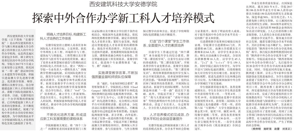 办学水平的提升,其社会影响力也不断扩大,2020年学院获得“陕西省中外合作办学优秀机构”称号,执行院长熊仲明教授同时获得“陕西省中外合作办学优秀专家”荣誉称号;学院还成功承办“陕西省第四届中外合作办学研讨会”,先后接待全国20余所中外合作办学高校来院调研交流。同时,学院还同西安航天基地、陕西建工集团、京东云等9家单位签署创新创业实践基地协议,为学生创新创业搭建了实践平台。学院先后主持陕西省高等教育学会中外合作办学分会研究项目1项、陕西省教工委研究项目1项、西安建筑科技大学高等教育研究教改项目8项,完成了西安建筑科技大学校级教改项目“中外合作办学机构人才培养模式构建与探索研究——以探球比分