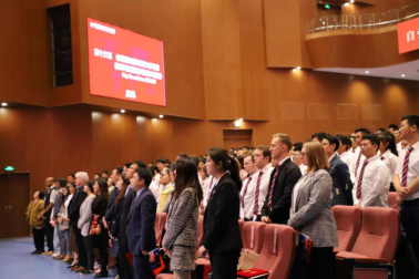 我校副校长王树声致辞,他强调全校师生应凝心聚力,共同为培养一流的国际化人才努力奋斗。他向生逢新时代的同学们提出三点希望:一是希望同学们成为志存高远,拥有家国情怀的人;二是希望同学们成为脚踏实地,勇于担当负责的人;三是希望同学们成为全面发展,拥有国际视野的人,在社会实践和国际交流中了解中国、认识世界,努力成为基础扎实、知识广博、底蕴深厚、兼收并蓄的一流人才。