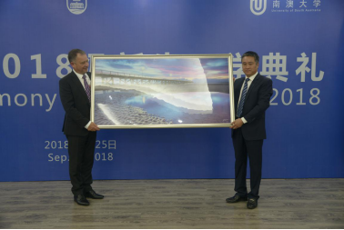 西安建筑科技大学副校长牛荻涛与南澳大学副校长Allan Evans代表两校互赠礼物。