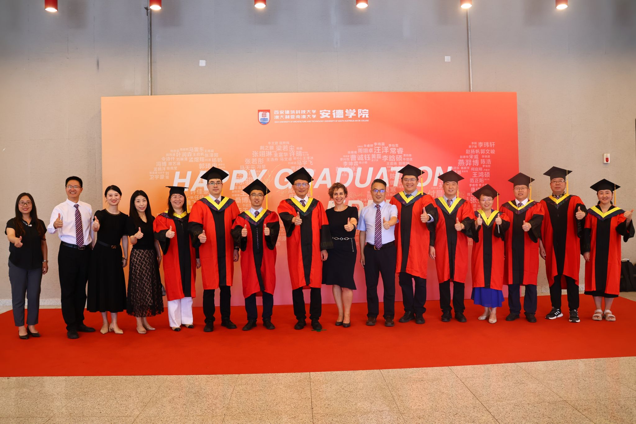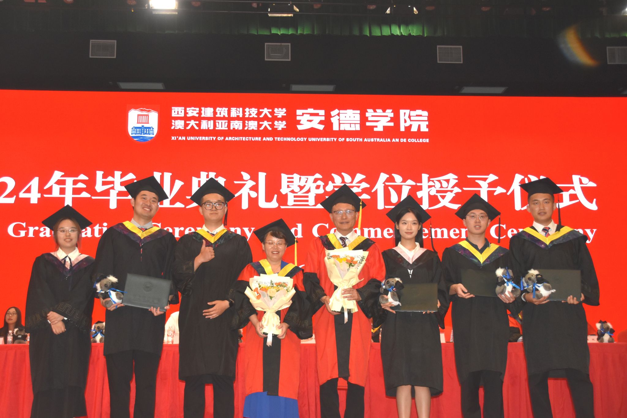 执行院长熊仲明、副院长赵蕾为2024届毕业生扶正流苏、颁发学位证书并合影留念。