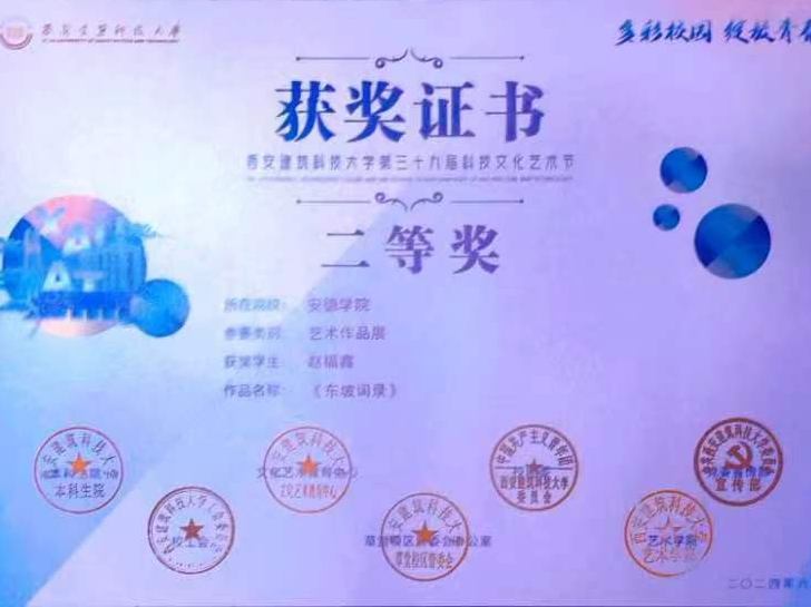 在“艺彩纷呈”师生艺术作品展中,土木2102班赵福鑫同学以笔墨传情,将宋代大文豪苏轼的诗词精髓完美呈现于作品之中,将创意与才华挥洒得淋漓尽致。《东坡词录》在众多佳作中脱颖而出,荣获二等奖。