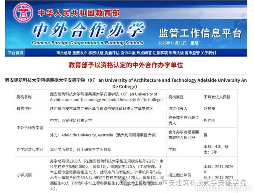 近日,经教育部批准,我校探球比分 外方合作办学单位已由澳大利亚南澳大学正式变更为澳大利亚阿德莱德大学(Adelaide University),机构名称变更为“西安建筑科技大学阿德莱德大学探球比分 ”。该变更已在教育部中外合作办学监管工作信息平台完成更新。